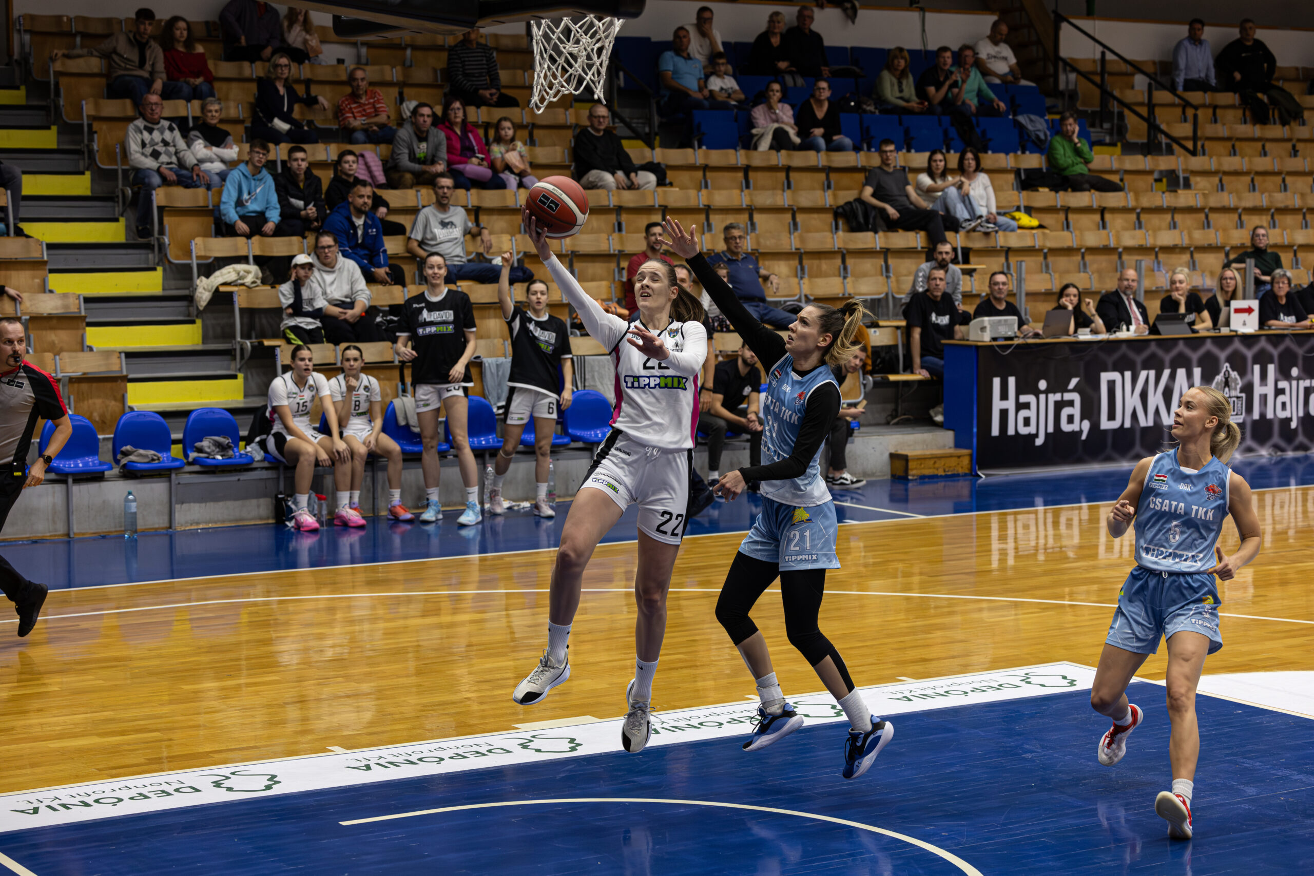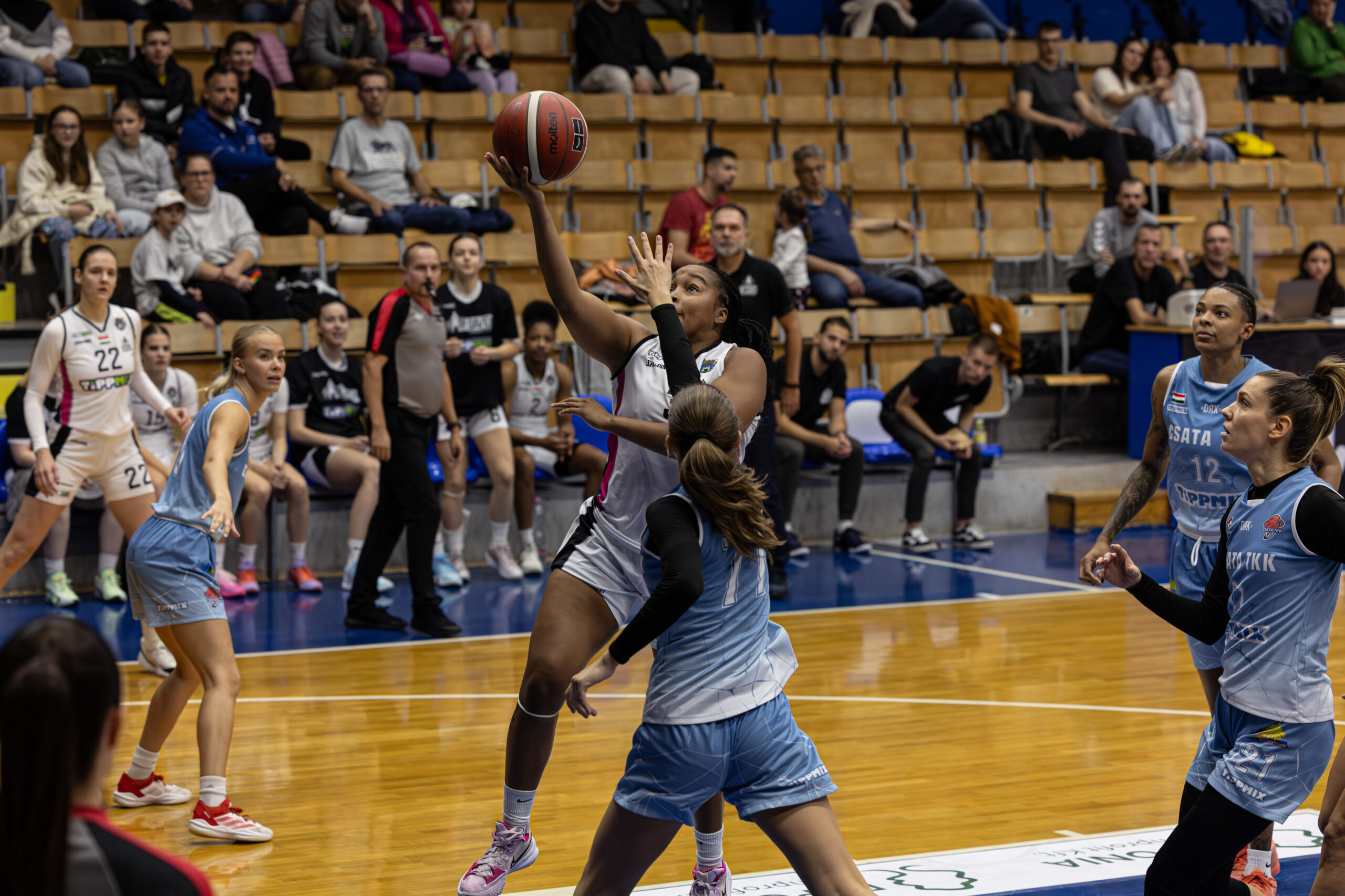 Dávid Mia és Papp Lilla nélkül vágtunk neki a mérkőzésnek, az ellenfélnél viszont ott volt a pályán a tavaly még nálunk játszó Hegedűs Janka. Az első pillanattól kezdve a Csata irányította a találkozót: az első negyedben 0-6-os futással indított, és már ekkor komoly előnyre tett szert. Az első tíz perc végén 12-19 állt a táblán – sajnos a védekezésben és a támadások lezárásában is akadtak hiányosságok. A második negyedben ponterősebbek lettünk, ám a légiósai által repített Csata tartotta a ritmust, nem engedte átvenni az irányítást.